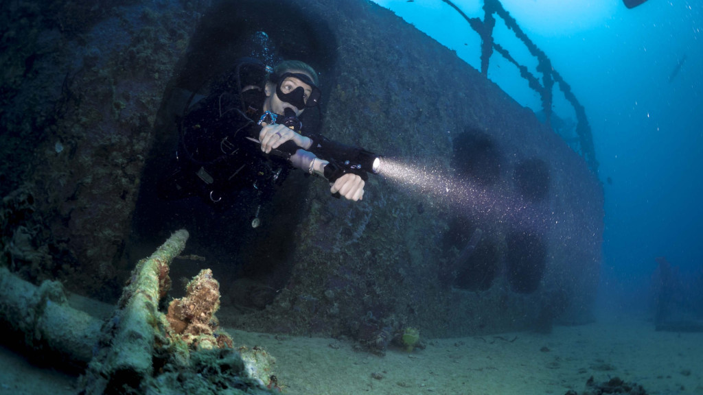 The beam of light guides divers through narrow passages and helps them navigate the complex terrain of the wreck site, ensuring a safe and immersive diving experience.