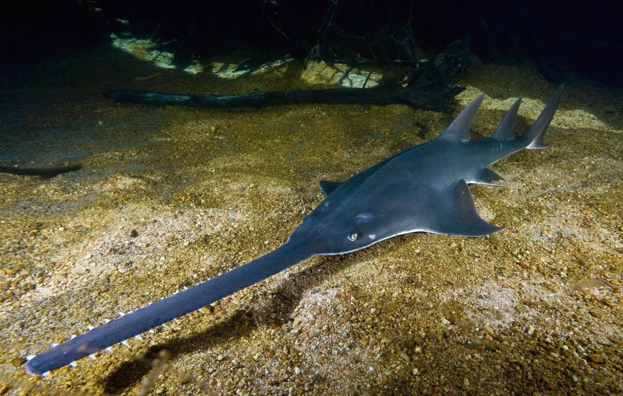 The smalltooth sawfish is an unusual fish that resembles a shark with a long, saw-like snout, which it uses to catch fish and dig into the sand.